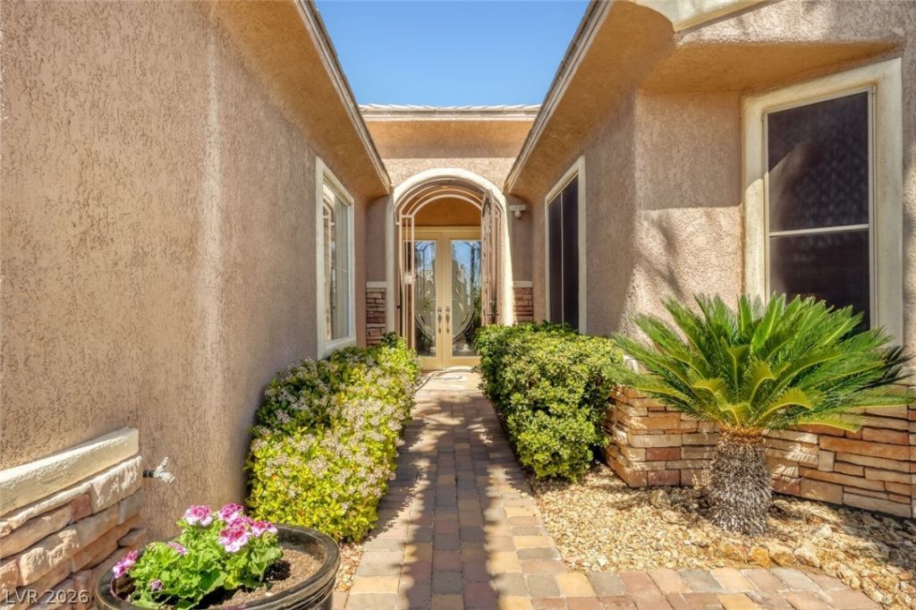 This beautifully maintained Mediterranean/Spanish-inspired home, upgraded with $120K in improvements, in Siena, features bright, inviting living spaces with light wood-style flooring, plantation shutters, and a seamless flow from the living room to the dining area and out to the private backyard. The spacious primary bedroom includes an ensuite with a double cherry-wood vanity, quartz counters, double shower, and private toilet room. The second bedroom offers a plantation-shuttered bay window, light carpet, and mirrored closet doors. A second full bath and a well-organized laundry room with garage access add convenience. Outside, the elevated corner lot showcases lush greenery, premium artificial turf, and some of the most impressive professional landscaping in Siena, creating a serene and private retreat.