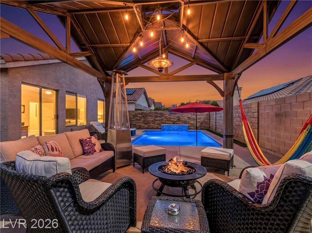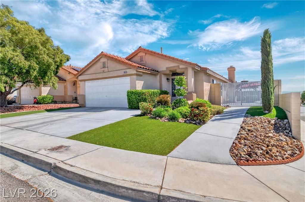 Single-story home on a premium corner lot in one of the most desirable Las Vegas locations, just minutes from the freeway and Downtown Summerlin. Upgraded with modern tile flooring throughout the entire home and remodeled bathrooms featuring modern finishes and glass-enclosed showers. The kitchen is equipped with modern stainless steel appliances, enhancing the home's sleek and updated feel. Enjoy an amazing backyard designed for true indoor-outdoor living, featuring a stunning newly built pool with heater and smart controls accessible from your phone, expansive covered patio, and fully finished concrete?creating a private, low-maintenance retreat ideal for relaxing or entertaining. Possible RV parking adds flexibility. A perfect combination of location, desirability, and opportunity.